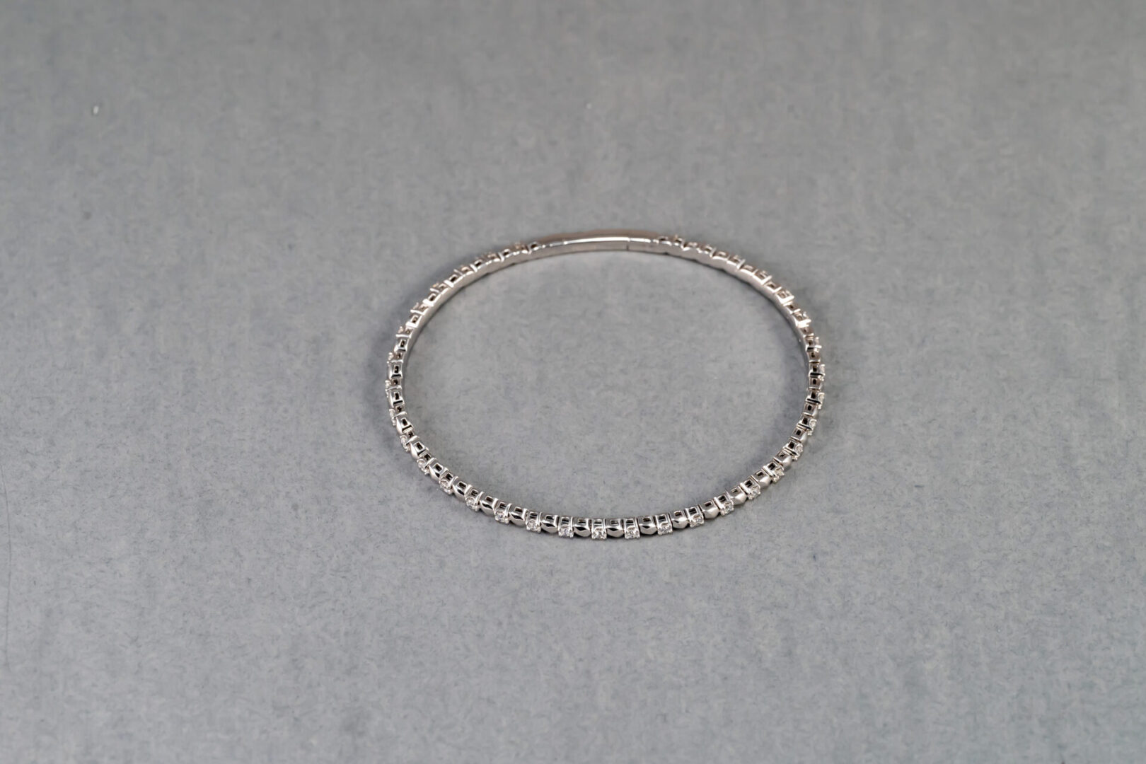 14k white gold diamond flexible bangle bracelet containing 34  round brilliant cut diamonds weighing 1.00cts. total weight.  The clarity is VS2 and G in color.  The diamonds are set in prongs
