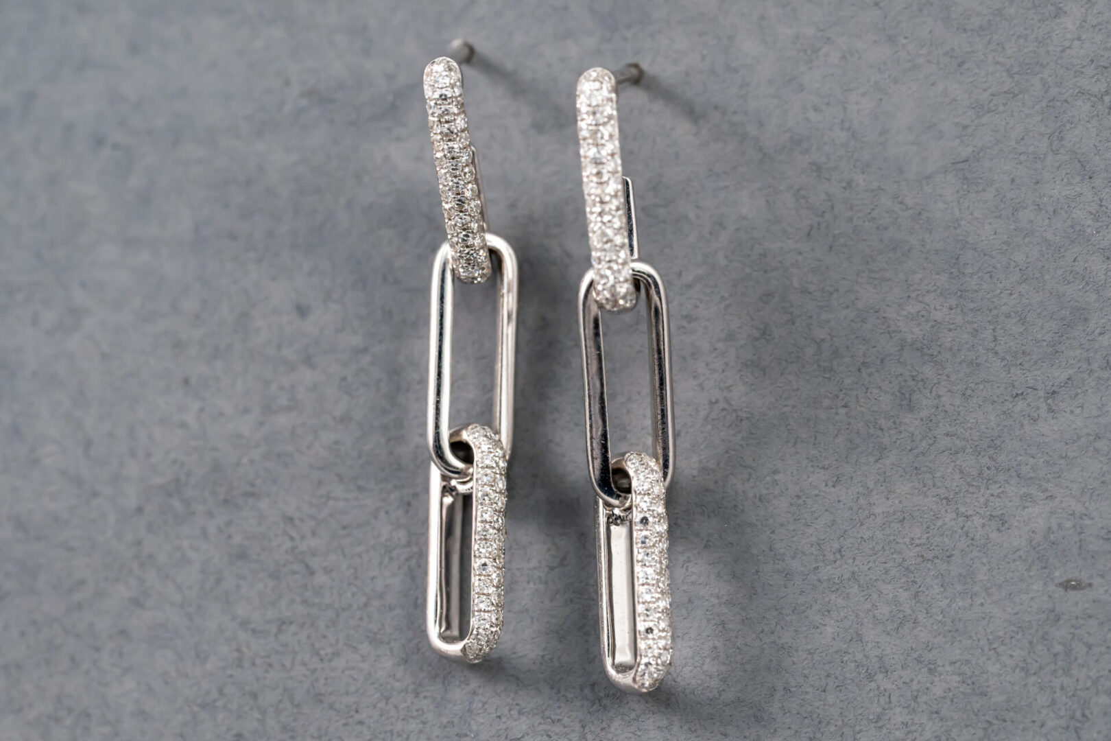 One pair of 14k white gold diamond hanging paper clip earrings containing 172 round brilliant cut diamonds weighing .396cts. total weight. The clarity is VS2 and G in color. The diamonds are micro pave` set.