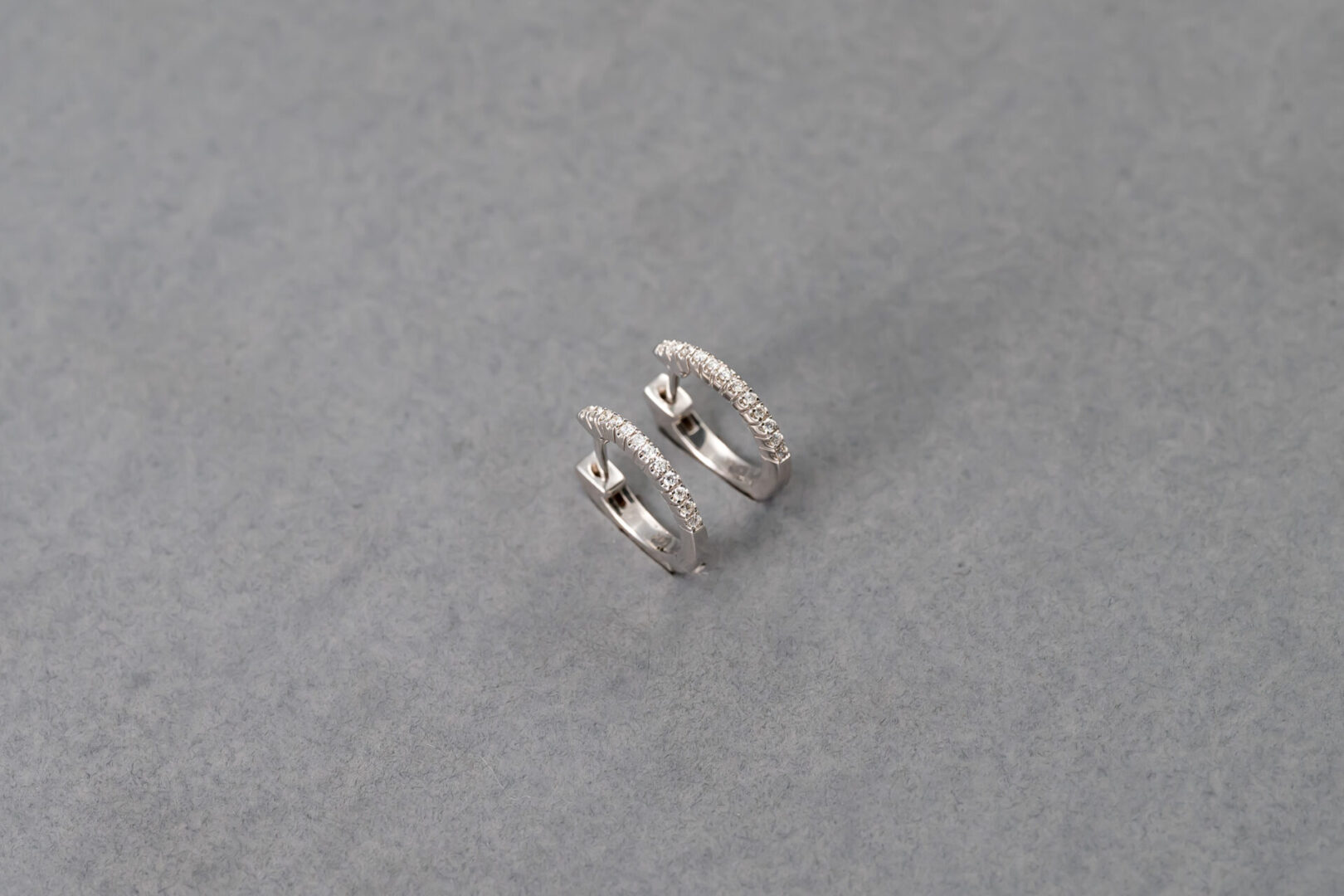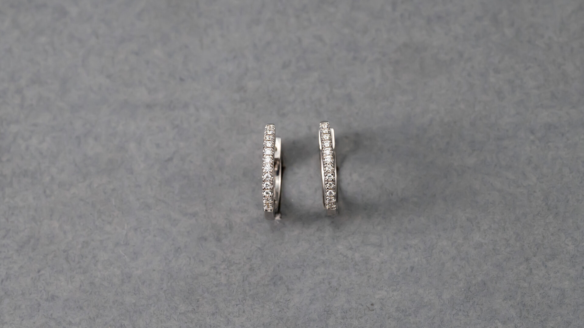 One pair of 14k white gold diamond huggie earrings containing 24 round brilliant cut diamonds weighing .10cts. total weight. The clarity is VS2 and G in color. The diamonds are set in prongs.