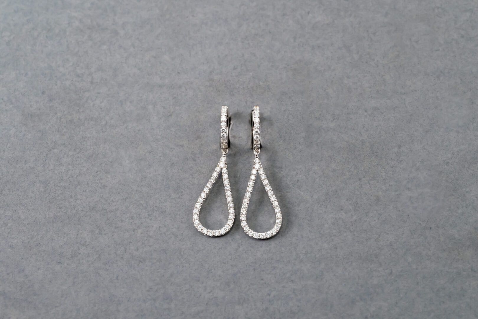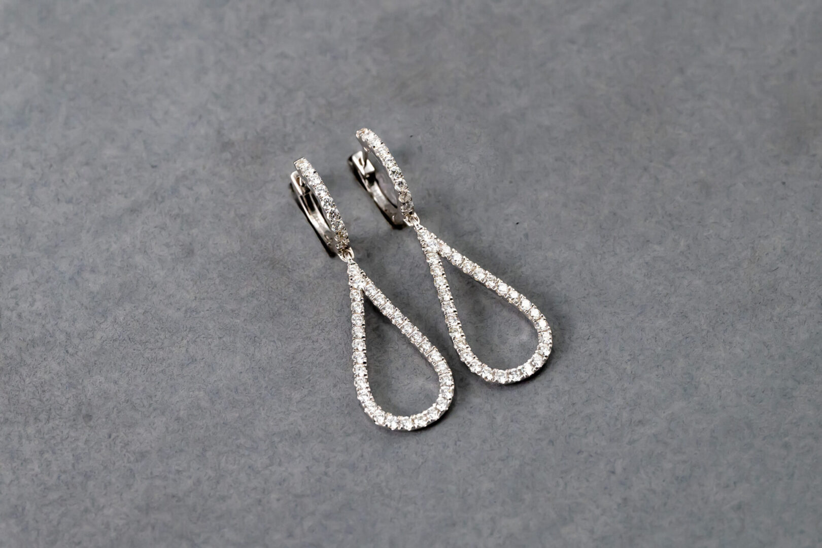 One pair of 14k white gold diamond tear drop earrings containing 38 round brilliant cut diamonds weighing .90cts. total weight. The clarity is VS2-SI1 and G in color. The diamonds are set in prongs.
