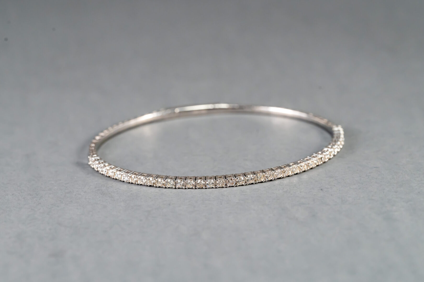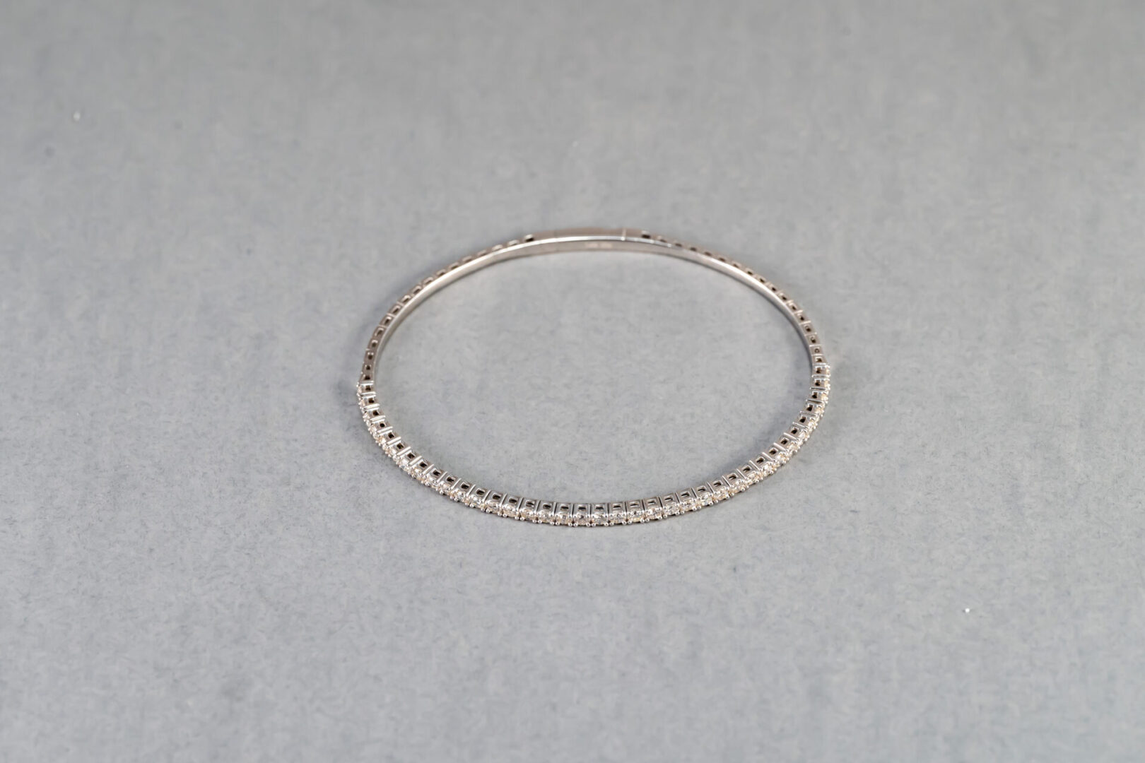 14k white gold flexible bangle bracelet containing 37 round brilliant cut diamonds weighing 1.50cts. total weight.  The clarity is VS2-SI1 and G in color.  The diamonds are set in prongs.