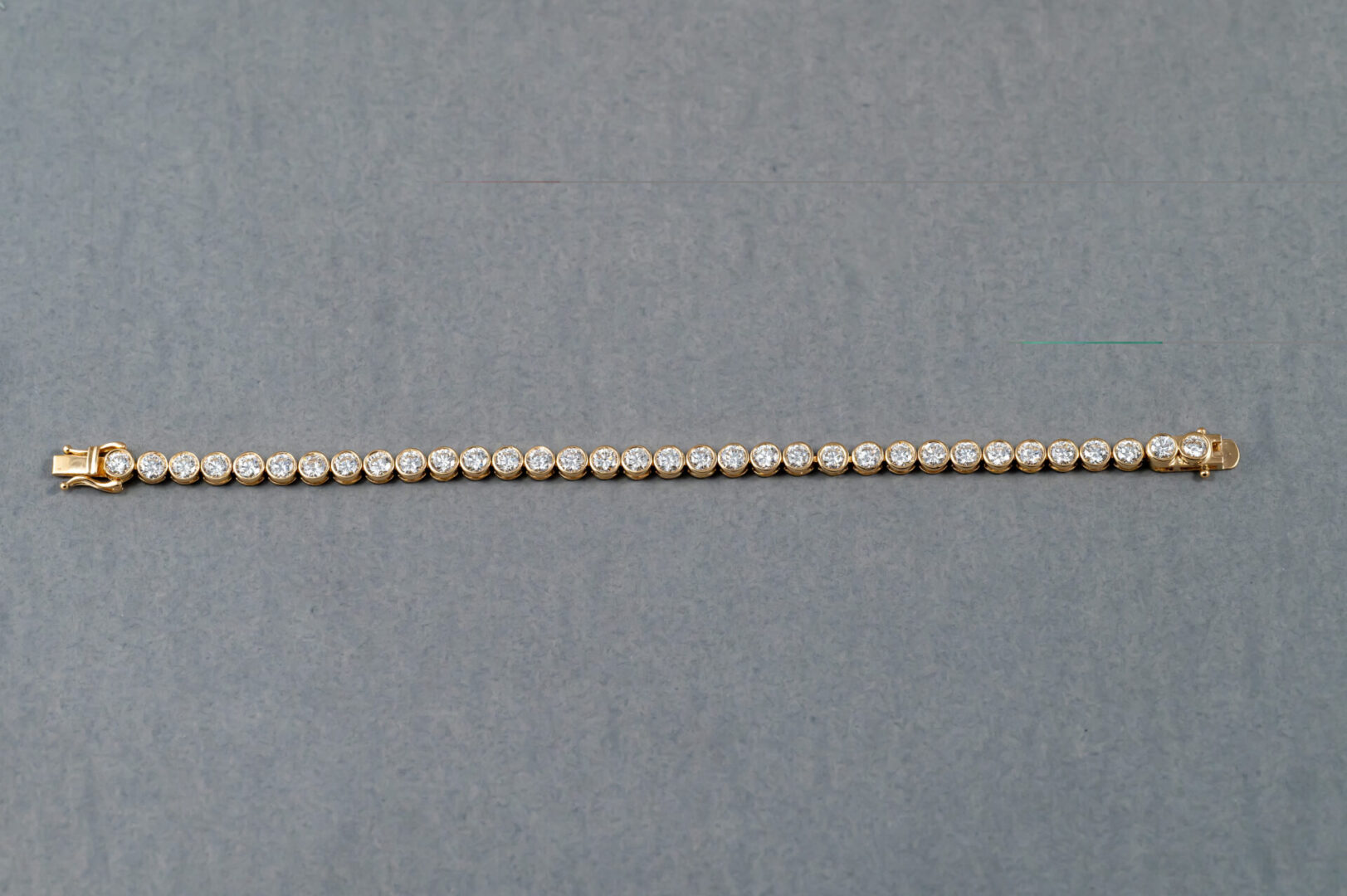 14k yellow gold lab grown diamond bezel set bracelet containing 34 lab grown round diamonds weighing 9.20cts. total weight.  The clarity is VS1-VS2 and F-G in color.  The diamonds are bezel set.