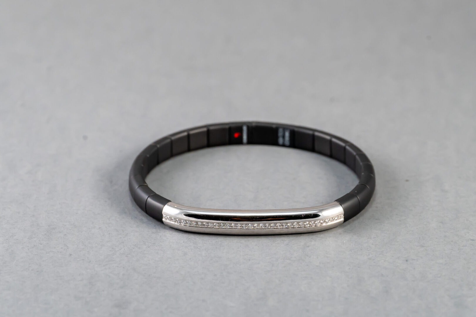 18k white gold diamond and ceramic stretchable bracelet designed by Roberto Demeglio containing round brilliant cut diamonds weighing .32cts. total weight. The clarity is VS2 and G in color.