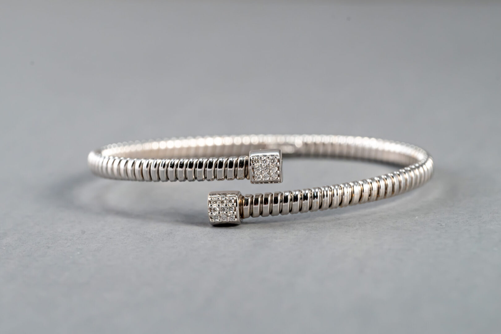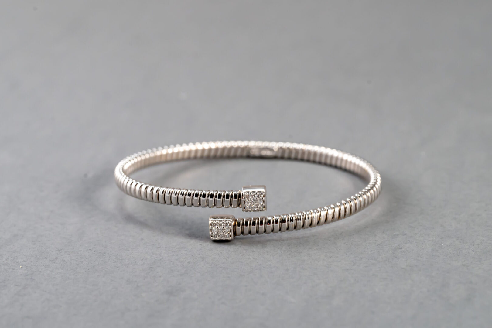 18k white gold diamond flexible bangle bracelet containing 18 round brilliant cut diamonds weighing .17cts. total weight. The clarity is VS2 and G in color. The diamonds are pave` set.