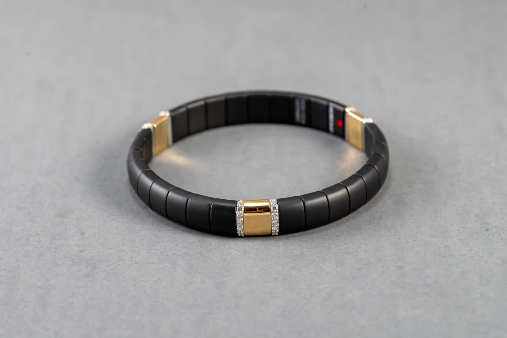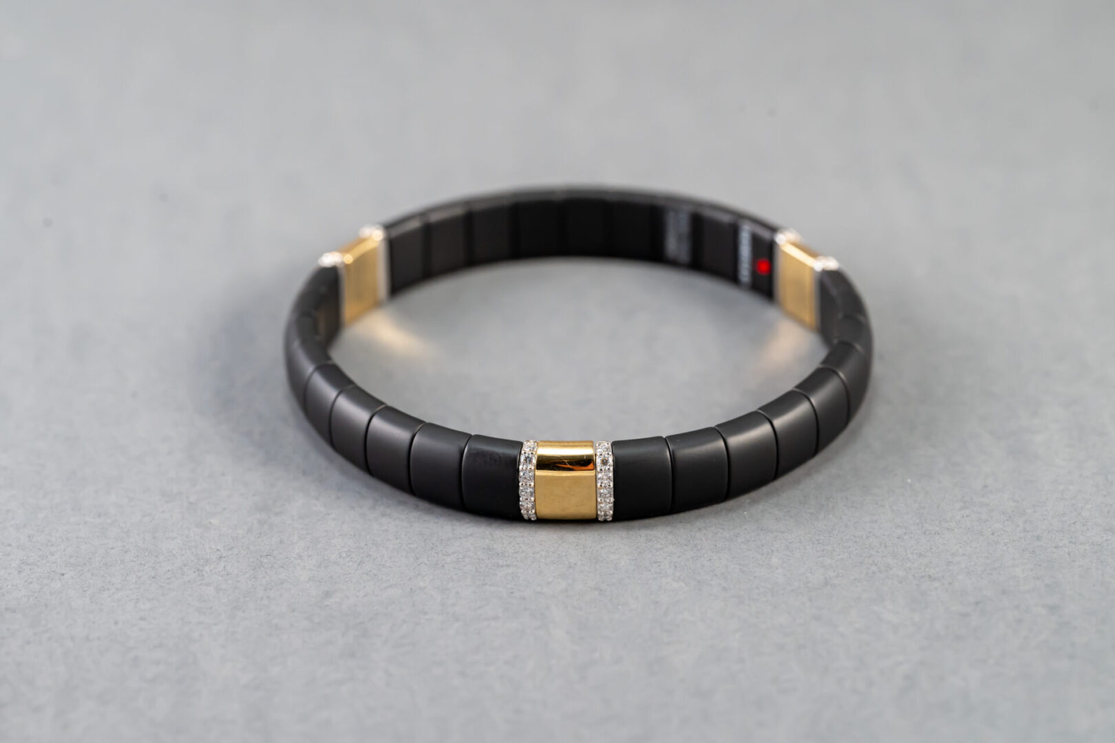 18k Yellow and white gold ceramic and diamond stretchable bracelet designed by Roberto Demeglio containing round diamonds weighing .54cts. total weight. The clarity is VS2 and G in color. The diamonds are set in prongs.